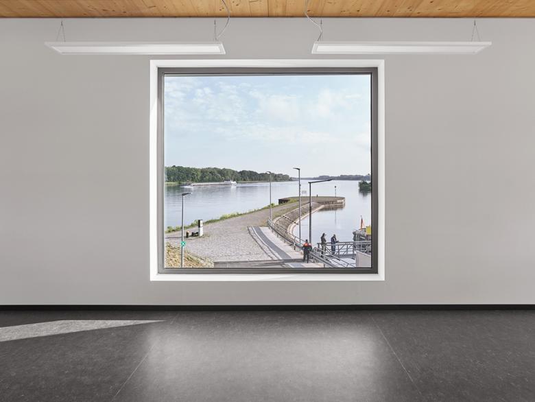 Die Konstruktion wurde in Holz-Hybrid-Bauweise ausgeführt, d.h. im Erdgeschoss aus Gründen des Hochwasserschutzes Stahlbeton und im Obergeschoss Holzbau, wobei das Prinzip des Tragwerks dem eines Schiffes vergleichbar ist: Die Spanten werden zu Schotten, die raumhoch das Gebäudeinnere gliedern. Ihre t-förmige Ausbildung ermöglicht zugleich die symmetrischen Auskragungen an den Längsseiten. Im Unterschied zu den äußeren Fassaden sind die Wände und Decken des zurückspringenden Erdgeschosses mit einem alternierend gekanteten, bronzefarbigen Lochblech verkleidet. Dessen Ausführungsdetails nehmen gleichwohl die handwerkliche Genauigkeit der Aluminium-Schindeln der übrigen Fassaden auf.