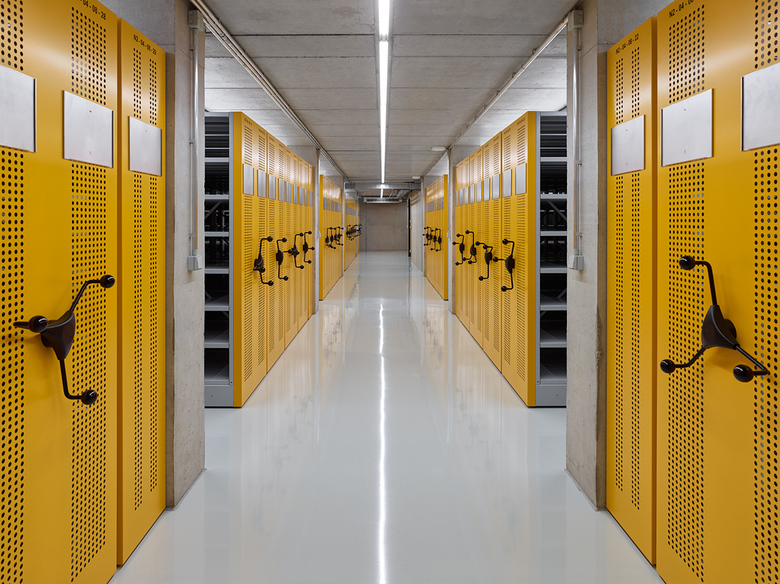 Lamellen aus Betonfertigteilen an der Fassade assoziieren das Lagern, Schichten und Stapeln im Archiv. Im Spiel aus Licht und Schatten tritt das Gebäudevolumen hinter die plastische Oberfläche. Die reduzierte Gestaltung sowie der Einsatz robuster Materialien und regionaler Baustoffe sind wesentliche Bestandteile der nachhaltig ausgerichteten Architektur.