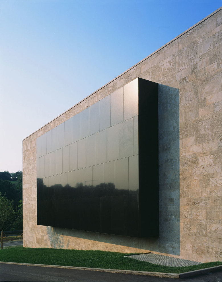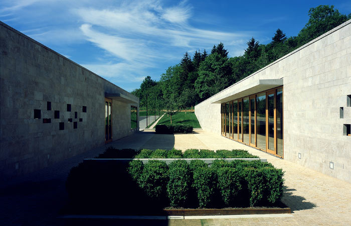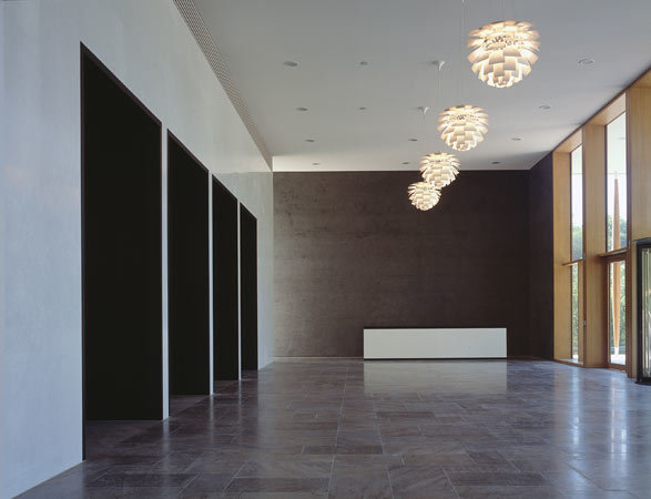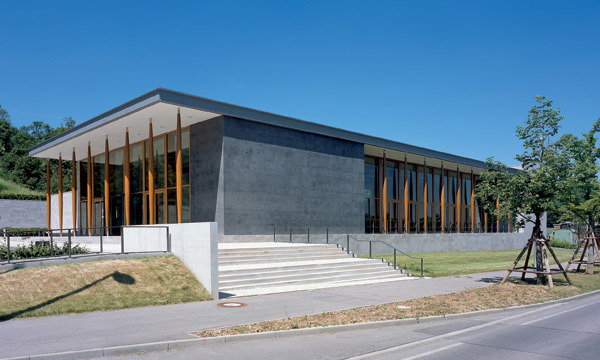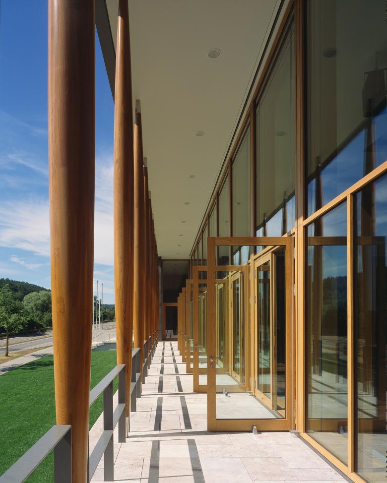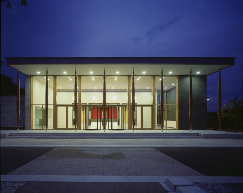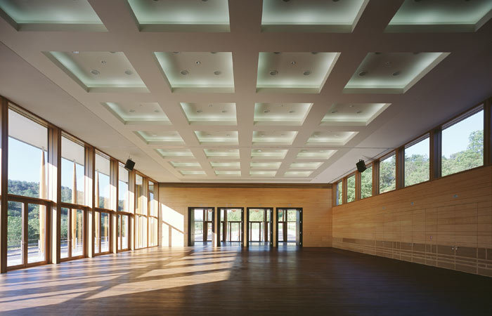 Der Gebäudekomplex der Festhalle setzt sich aus zwei gestalterischen Einheiten zusammen. Die Festhalle wird als eigenständiges Volumen parallel zur Straße positioniert. Das weit auskragende, flache Dach überspannt den Saal und das Foyer und bildet mit seinen Überständen großzügig überdachte Außenbereiche, die ganz selbstverständlich zum Verweilen einladen. Die Fassaden von Foyer und Saal werden durch große Glasflächen zur Landschaft geöffnet. Dem Saal wird eine "Stadtloggia" vorgelagert, gebildet durch das weite Dach und filigrane Vollholzstützen - eine Austrittsmöglichkeit für die Festhalle, ein Ort der Kommunikation, Archetypus der "res publica".