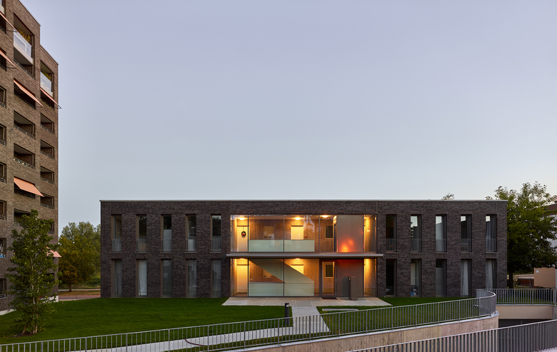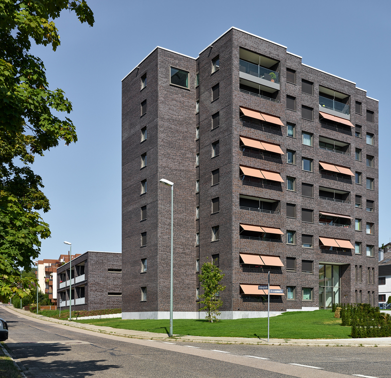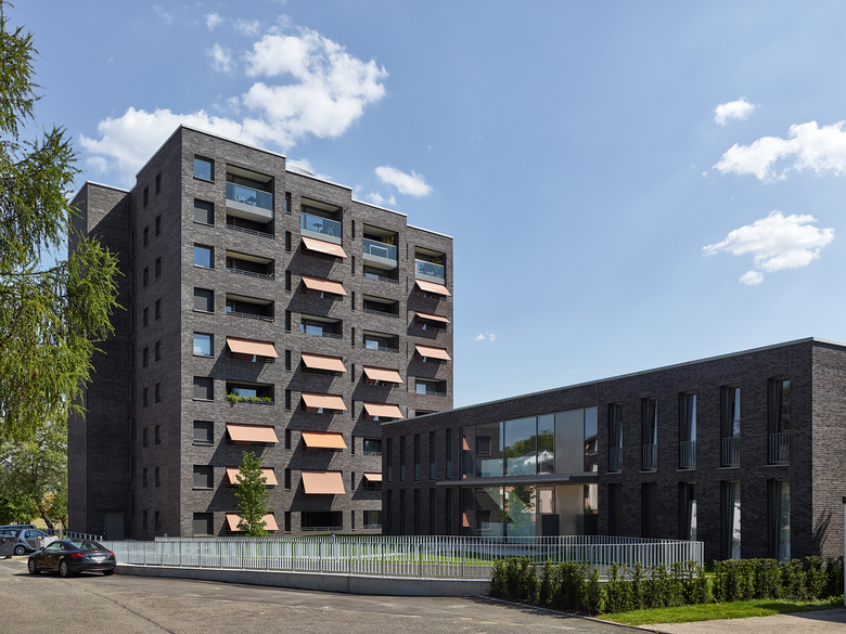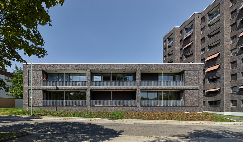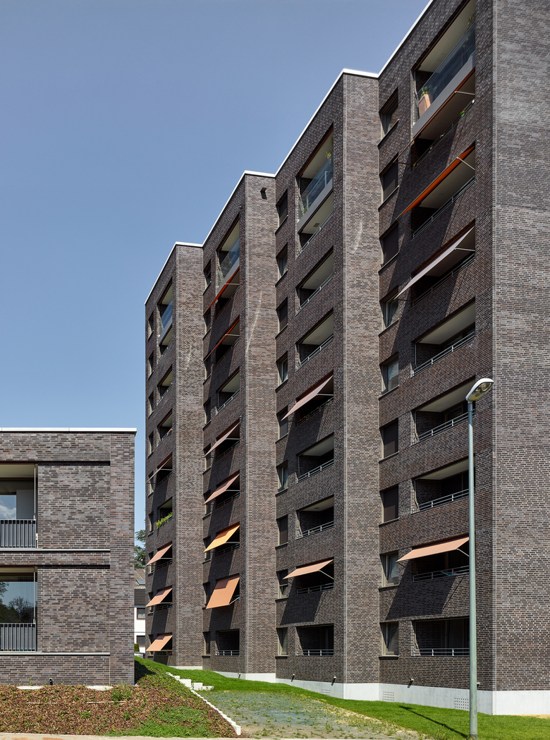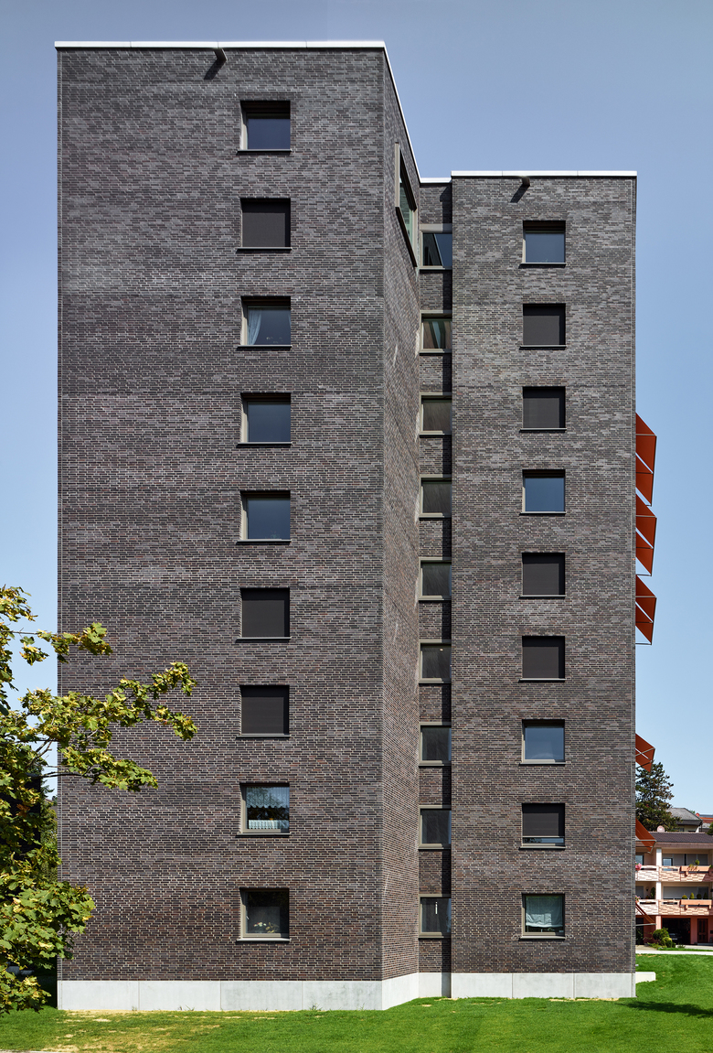 Der zweigeschossige liegende Baukörper bildet mit dem aufsteigenden Punkthaus ein Ensemble in einem üppigen Freiraum. Die beiden Gebäude haben einen einheitlichen Duktus, der durch die Verwendung von einer Klinkervorsatzschale diesen kräftig unterstreicht. Mit der Neufassung des bestehenden Hochhauses wird dessen Typologie noch stärker herausgearbeitet. Die für jene Zeit typische Schottenbauweise führt zu einem einseitig versetzten Baukörper, der nunmehr mit geschossweise angeordneten Loggien eine starke plastische Durcharbeitung erhält. Lediglich im Eingangsbereich wird durch die Herausnahme eines Deckenfeldes eine zweigeschossige Halle geschaffen, die dem Gebäude mit immerhin 50 Wohnungen ein angemessenes Entrée gibt.