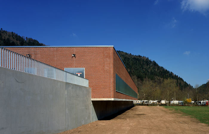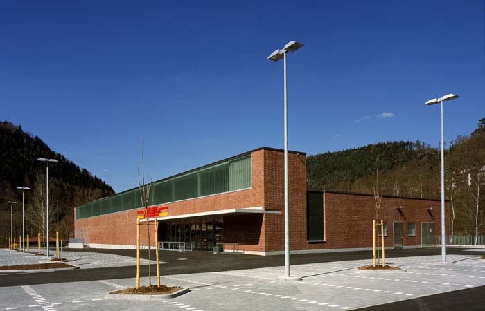 Am Ortseingang des Kurortes Bad Liebenzell wird, auf ein parallel mit der Straße verlaufendes Grundstück, ein Baukörper für einen SB-Markt errichtet. Mit einer rechteckigen Grundform, die zur Straßenseite ein durchlaufendes Oberlicht erhält, wird eine städtebauliche Kante geschaffen. Auf der dem Fluss zugewandten Seite kragt das Gebäude auf seine Gesamtlänge aus. Der Baukörper ist vollflächig verklinkert und tritt als kompaktes Volumen in Erscheinung. Lediglich der Eingangsbereich ist zur Straßenseite durch ein Vordach hervorgehoben. Die Kubatur ist auf das Wesentliche reduziert und beruhigt mit ihrem zeitlosen Ausdruck die heterogene Peripherie der Gemeinde.