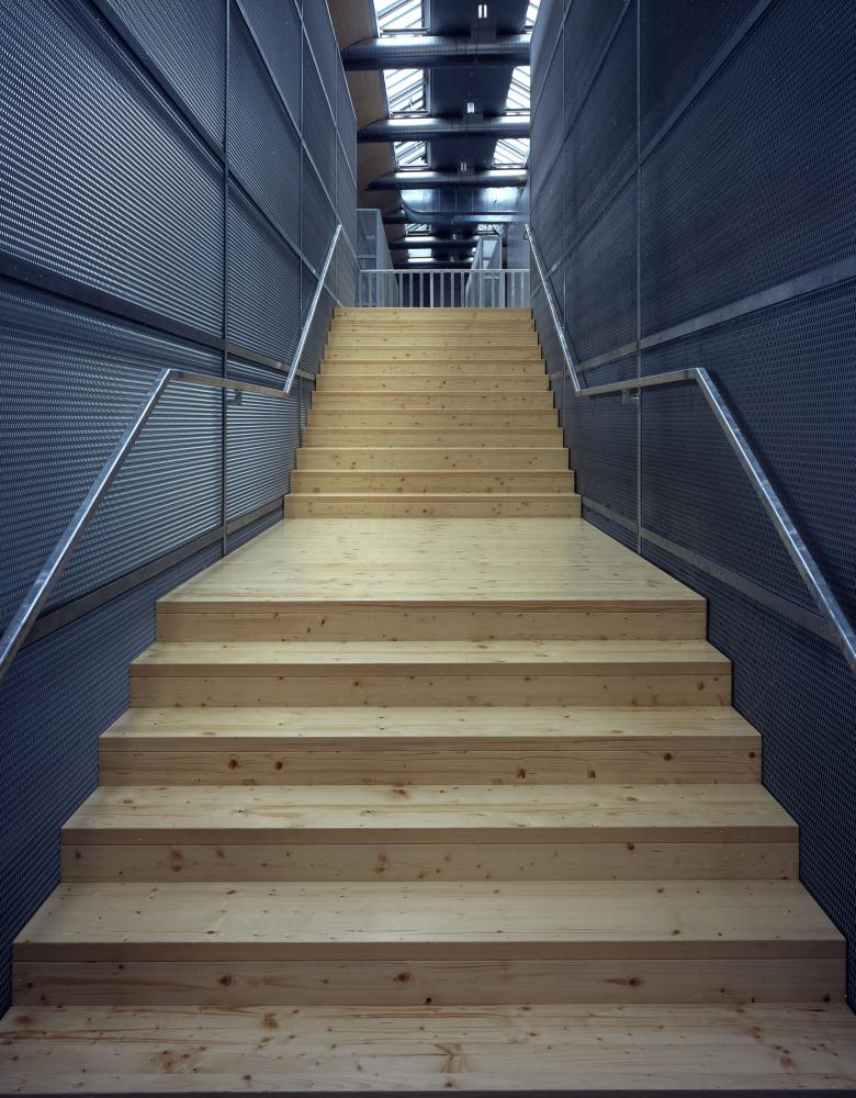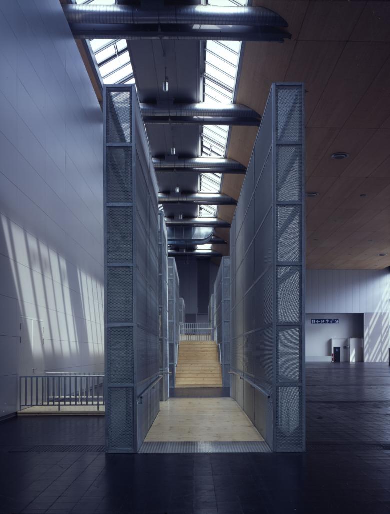 Die Zugänge wurden mit großen Wandscheiben aus mit Streckmetall verkleideten Gerüsten markiert, die gleichzeitig die unterschiedliche Höhen des ansteigenden Parketts ausglichen und sich gegen die enorme Dimension der bestehenden Messehalle behaupteten. Der Backstagebereich und die an der hinteren Stirnseite platzierte Lüftungszentrale wurden ebenfalls mit einer Haut aus Streckmetall verkleidet, welche die technische Funktion dieser baulichen Applikationen optisch unterstützte.