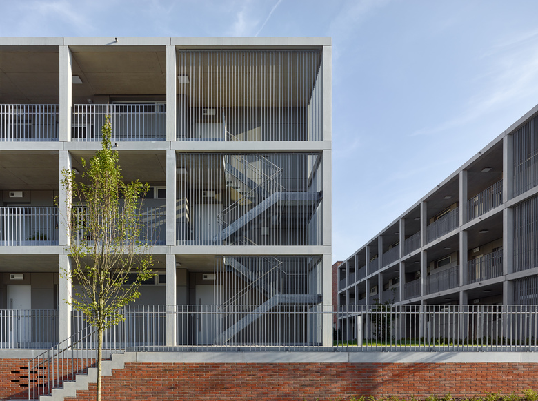 Die Gliederung der Grundrisse zeichnet sich in den Fassaden ab, sodass der regelmäßige Rhythmus die Neutralität und Zeitlosigkeit der Gebäude unterstreicht und im Übrigen zu einem angemessenen Ausdruck eines Geschosswohnungsbaus führt.