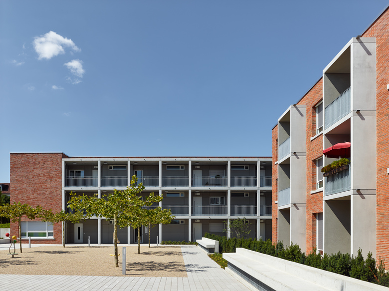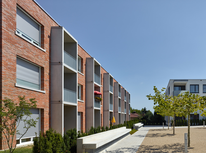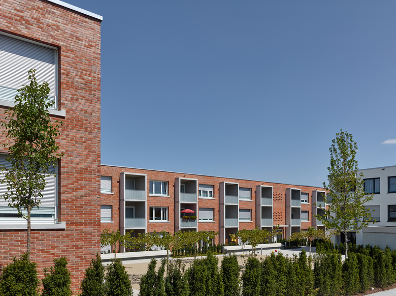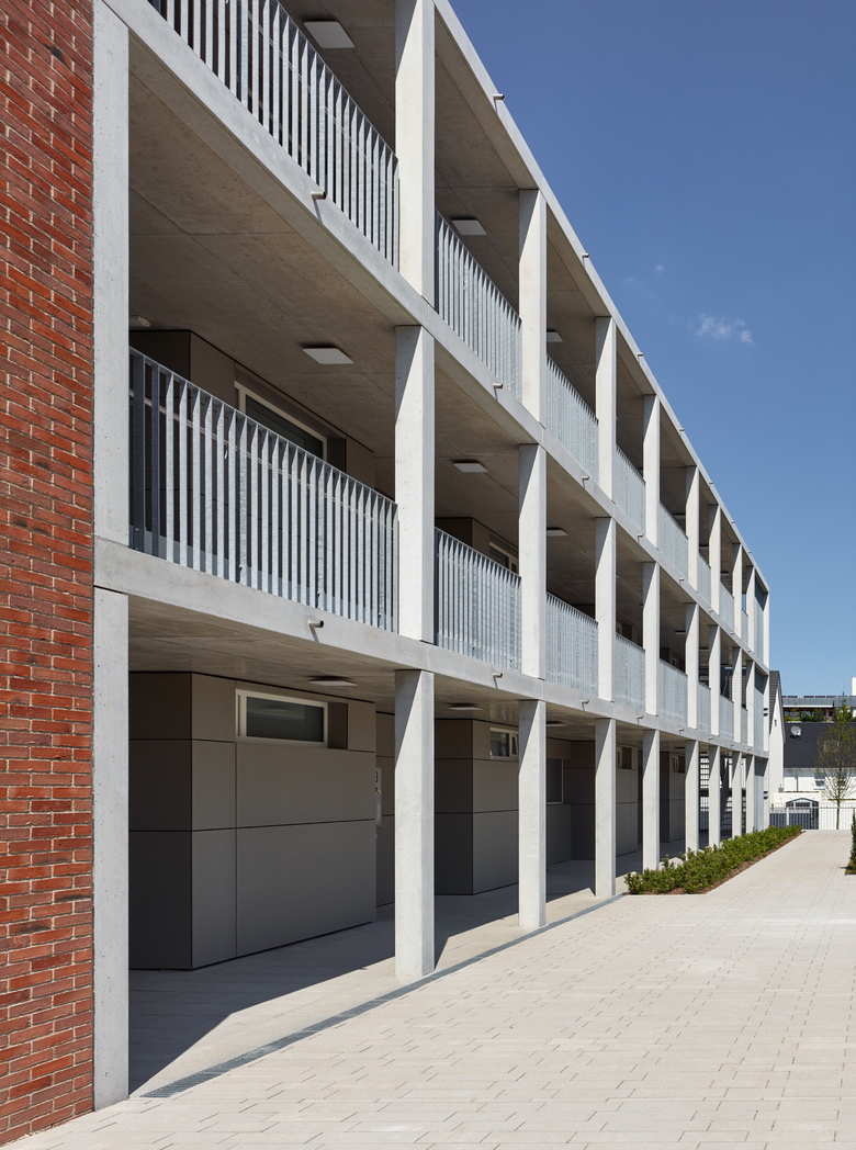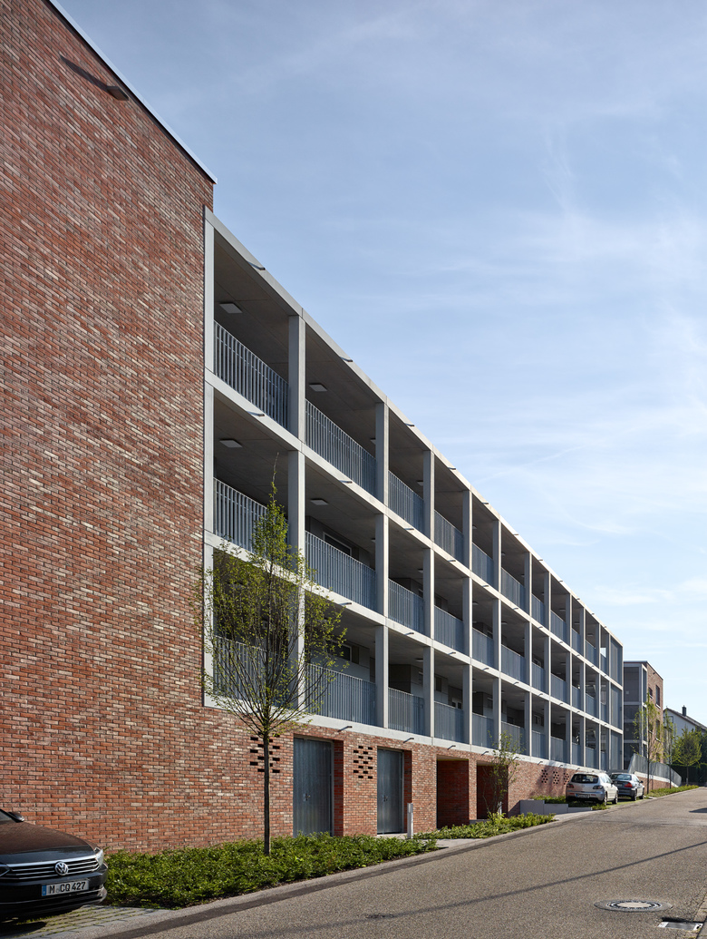 Der architektonische Ausdruck der Gebäude ist zeitlos. Der nach außen gewandte Laubengangtyp führt zu einer neutralen Maßstäblichkeit, die aufgrund der linearen Gliederung und Rasterung dem Haus eine besondere Note verleiht. Die Laubengangtypen erhalten zudem durch ihre Klinkerfassade eine Feingliedrigkeit, die für das Ensemble insgesamt bestimmend ist. Die Wahl von Materialien, denen man einen Alterungsprozess zugesteht, ist bewusst getroffen. Sie gibt den Gebäuden einen besonderen Charakter mit haptischer Qualität, die im Geschosswohnungsbau mit Blick auf die soziale Akzeptanz wichtig ist.