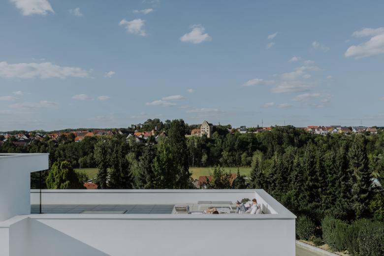 Im wahrsten Sinne des Wortes das Highlight bildet die Skylounge auf dem Dach der Villa Fröschle. Sie beherbergt ein kleines zurückgezogenes Arbeitszimmer, die Hausbar und ein gemütliches Kaminzimmer. Ein einzigartiger Ort an den sich der Bauherr gerne in den Arbeitspausen zurückzieht. Hier oben ist man dem Alltag und allem geschäftigen Treiben völlig entrückt. Der Himmel erscheint näher als die Erde. Umgeben ist die Lounge von einer großen, umlaufenden Dachterrasse, die durch die brüstungshohe Attika einen perfekten Sichtschutz gewährt. Dort lässt sich ganz entspannt ein 360°-Rundumblick über den Dächern oder ein Sundowner–Drink vor dem Zubettgehen genießen.