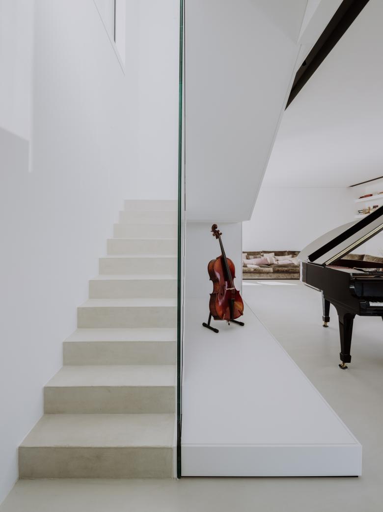 Das Thema Musik zieht sich wie ein roter Faden durch das gesamte Wohnhaus. Im Obergeschoss sind es der klassische Flügel und das Cello, die zentral an der Schnittstelle von Wohnen und Essen platziert wurden. Über die Treppe zur Skylounge auf dem Dach dringt Tageslicht in das Zentrum der Lebensräume. Weiß dominiert auch hier als Farbe in Kombination mit einem Fußboden in Sichtbetonoptik. Dennoch ist es Anna Philipp und ihrem Team durch den sensiblen Materialmix, unterschiedliche Oberflächen und eine differenzierte Haptik gelungen eine Wohlfühlatmosphäre zu erschaffen.