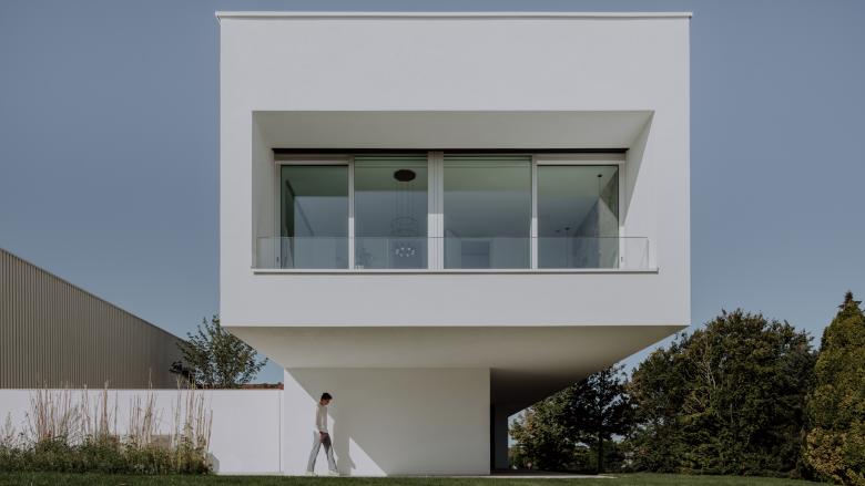 Über der Küche befindet sich ein begehbares Glasdach. Durch eine Pergolen ähnliche Konstruktion projiziert es im Verlauf des Tages ein spannendes und abwechslungsreiches Spiel von Licht und Schatten auf die darunter liegenden Küchenarbeitsflächen. Hinter einem der vermeintlichen, in einheitlich schlichten Weiß gehaltenen Küchenschränke verbirgt sich der Zugang zum privater Trakt der Bewohner mit Ankleide, Masterbad und Schlafzimmer. Letztere sind der aufgehenden Sonne entgegen nach Osten hin orientiert. Der Baukörper des Obergeschosses kragt hier weit über das darunterliegende Gartengeschoss aus und endet in einem über die gesamt Gebäudebreite laufenden Balkon.