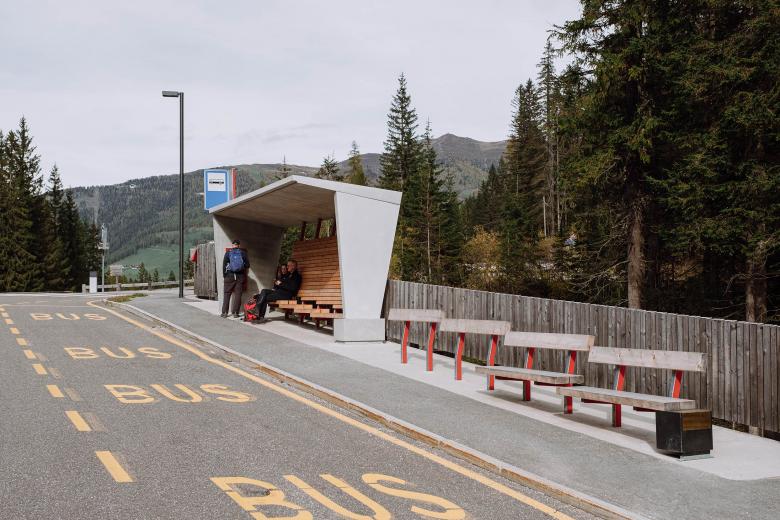 The shelter is designed to convey essential information in a small display case, provide enough sheltered seating, ensure clear visibility between bus drivers and those waiting, and offer a view of the surrounding landscape. A defining feature of the bus stop is the so-called "summit bench," designed by Plasma Studio in 2019 for the furnishings of the village of Sexten.