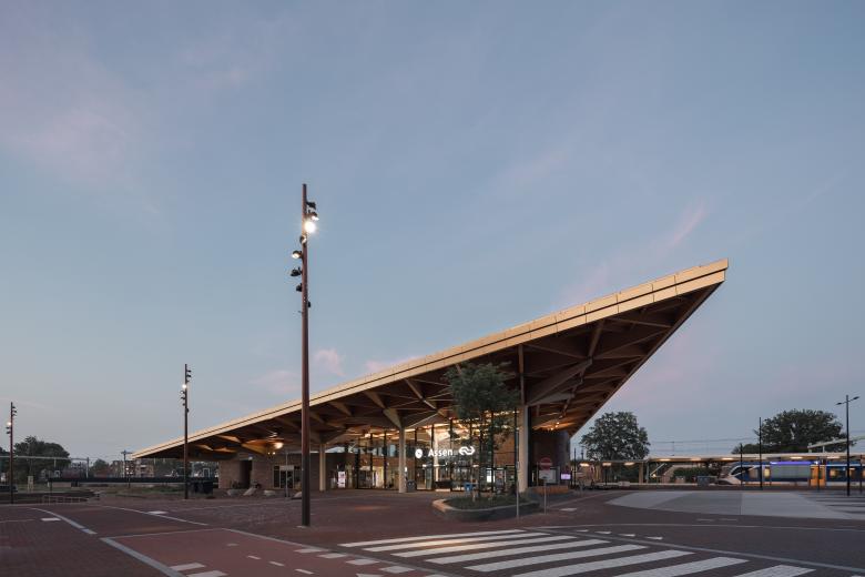 Assen Station has been completely transformed thanks to an extraordinary wooden structure. The new station is defined by a triangular wooden roof that appears to float above the several buildings below. It connects the railway line and two previously disjointed parts of the city with a single urban gesture. The construction of a new car tunnel under the station square has allowed a traffic-calmed public space to be created around the station. The station was designed by Powerhouse Company and De Zwarte Hond on behalf of NS, ProRail and Assen municipality.