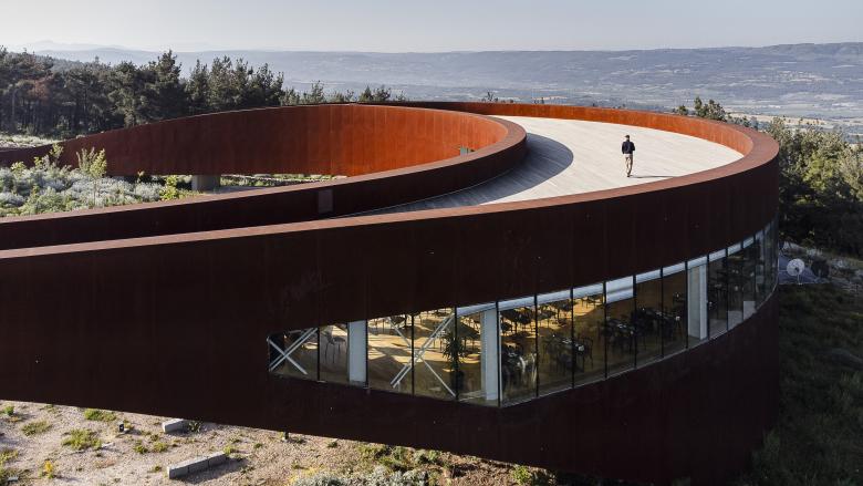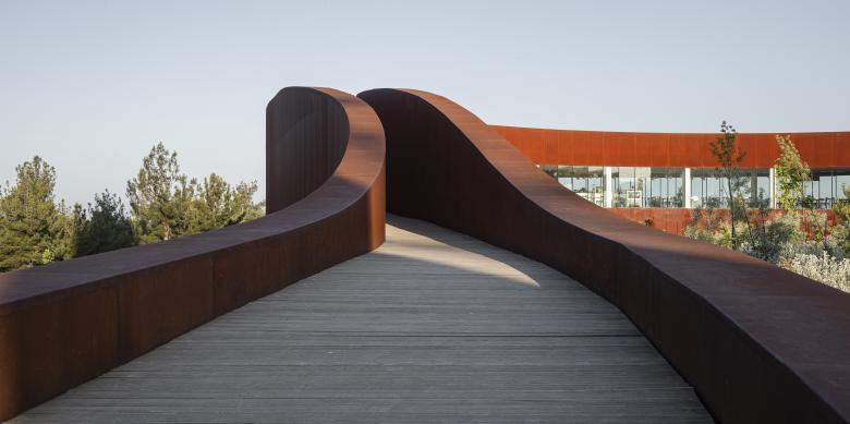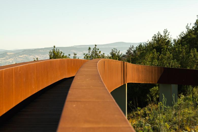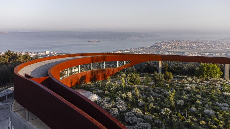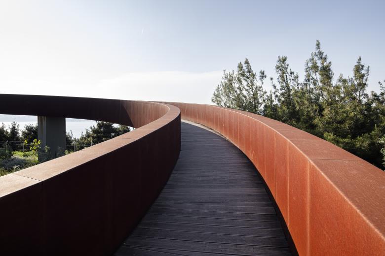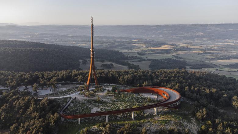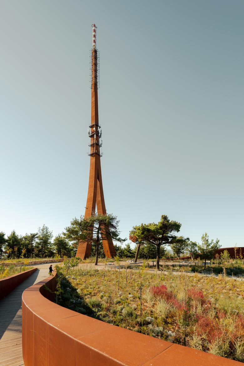 The tower stands proudly at the entrance, while the public facilities are placed at the opposite end, capitalizing on the stunning surrounding views of Çanakkale – city and seaport in Turkey’s Marmara region. A fluid outer band seamlessly connected these elements, offering visitors awe-inspiring vistas of the ancient Dardanelles. The loop's design artfully evolved into a tall entrance canyon, a wide viewing terrace deck, an elevated viaduct, and finally, the broadcast tower itself. The architectural intervention extended beyond aesthetics, nurturing a beautiful inner garden. Here, indigenous flora is showcased, and eroded land is rejuvenated with healthy soil and young forest trees. The park, deliberately designed to exude a natural and untamed ambiance, blurs the boundaries between the plot's vegetation and the surrounding forest landscape. A remarkable intervention that harmonizes technical design with environmental consciousness, while transforming the landscape into a public haven.