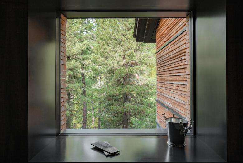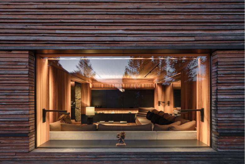 The chalet echoes traditional Alpine buildings with its tripartite structure of stone plinth, wooden walls and slate roof. The façade design, however, is a new departure. Executed in local timber, it forms a composition of alternating horizontal and vertical lines that reflect the contours of the landscape. Horizontally cut wooden tree trunks and vertical sandblasted planks are combined with horizontal bronze profiles to form a design that is elevated by its quality of execution: The wooden planks, for example, were carefully selected to avoid knots, which would have detracted from the clean lines of the composition. Varying window sizes and treatments – some placed in invisible frames, others in recessed bronze boxes – add to the depth of the design. A rustic chalet becomes a refined piece of architecture.