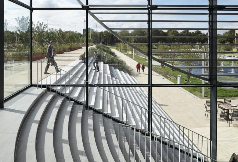 The completed pavilion – won through a competition in 2010 – forms the vibrant and central gathering space; for research to meet business and science to meet culture. The building is at once a café, restaurant, bar, study zone, meeting centre and multi-purpose auditorium.