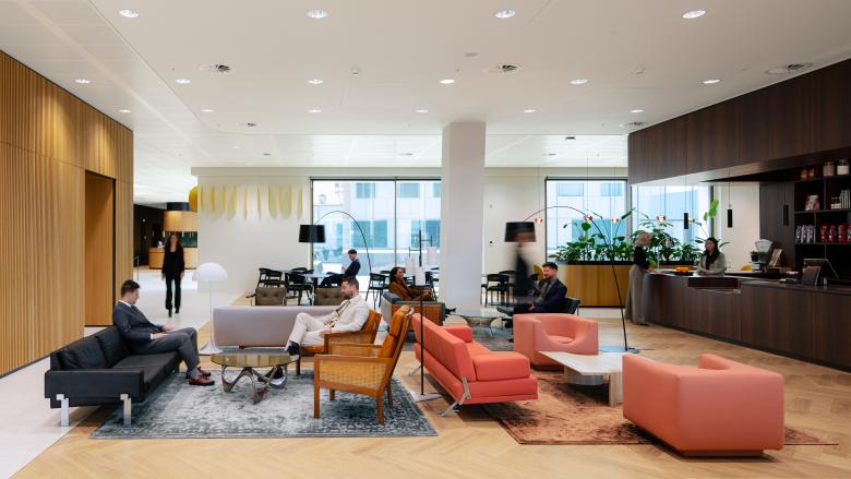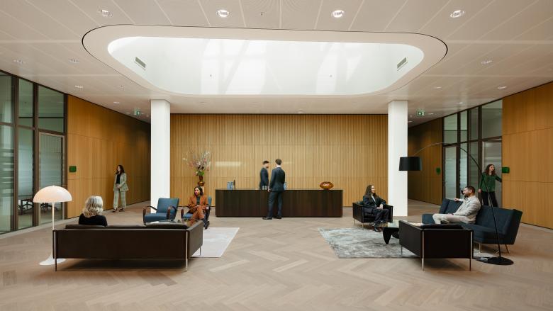 Our design opens up the lobby, greeting clients with an impressive welcoming gesture. Sweeping stairs, set against a green wall, lead upwards to the expansive atrium bathed in light. The lobby coffee bar adds to the feeling of informality and hospitality. For the law firm, the interior needs to combine very different needs: atmospheric public spaces like this for clients, staff meetings and socializing, and private working spaces for legal work. As confidentiality remains a key requirement, many of the 750 workstations are organized in closed rooms. While carefully ordered, these remain flexible for future changes in configuration. In between these ordered offices, we added more open working areas – for example at the corners of each floor – for support functions that need less privacy.