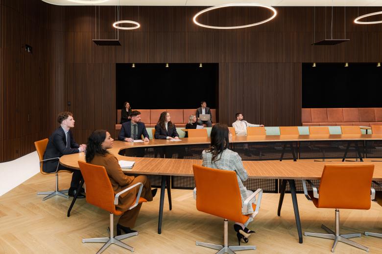 The law firm occupies two-thirds of the Hourglass building; 12 out of 18 floors, namely the bottom ten and the top two (a short-stay hotel occupies the intervening floors). The 17th floor is the office’s meeting center, with a wide variety of rooms for client briefings. Evoking the luxurious hospitality of hotels and VIP lounges, these vary in format yet echo each other in detailing and materialization. Above the meeting center, the loft is the social heart of the building, the place where the office entertains and celebrates in style. Correspondingly, the spaces here are more relaxed and lounge-like.
