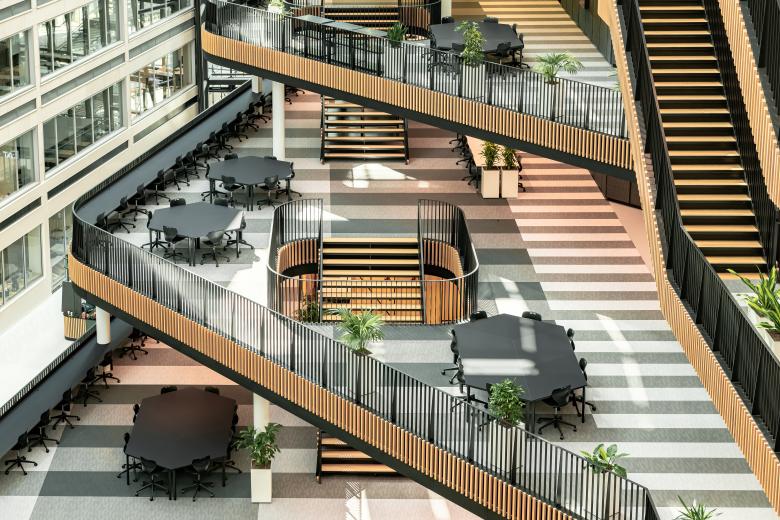 All storeys lead into the atrium and have open terraces where students can work on their projects. The atrium lends the building an open character with plenty of natural daylight. What we had in mind was a new public sphere serving as a theatrical space for major events and exhibitions on the ground floor and as tiered platforms where students from different disciplines will meet up. A place that fosters creativity and where people enjoy meeting up to show off their work and share their knowledge.