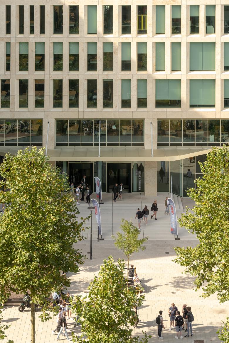 Education, research, professional practice, and the local area all converge in Jakoba Mulderhuis. We chose a rhythmic play of the façade imbued with subtle psychology. Its pattern runs upwards from left to right and is visible from all angles. The Jura limestone connects to the color tone of the adjacent Theo Thijssenhuis, ensuring harmony with the surroundings and reinforcing the monumental, future-proof character.