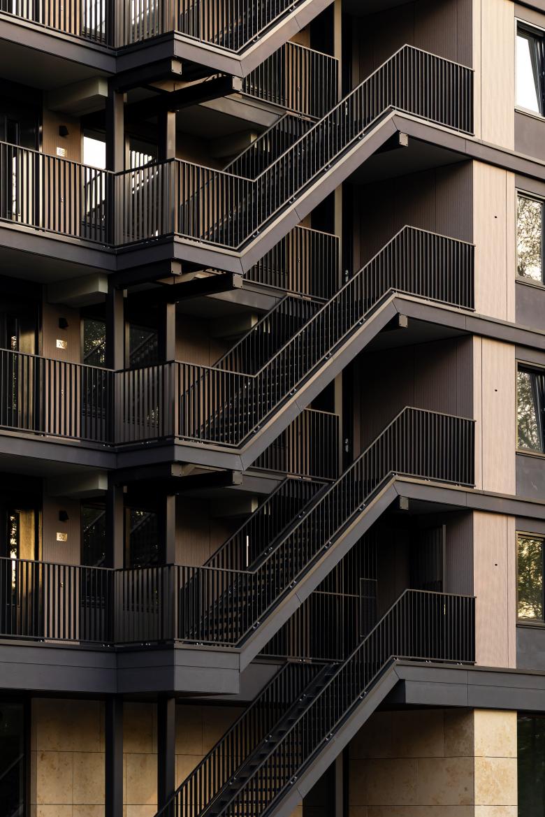 The ecological impact extends beyond the building, which is surrounded by a green, park-like garden designed by LAP Landscape & Urban Design. West facing balconies provide broad views and a strong connection to nature. The design also includes biodiversity features such as bird and bat nest boxes integrated into the façade.