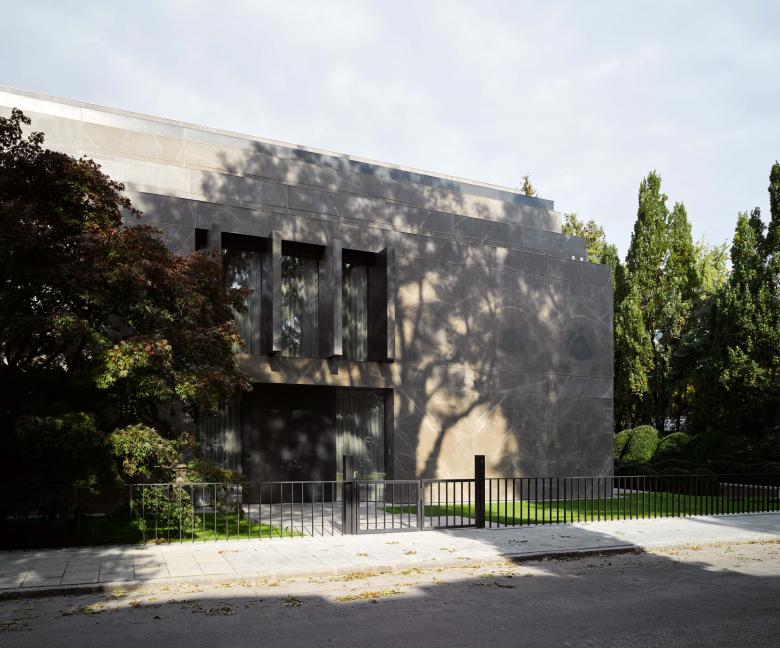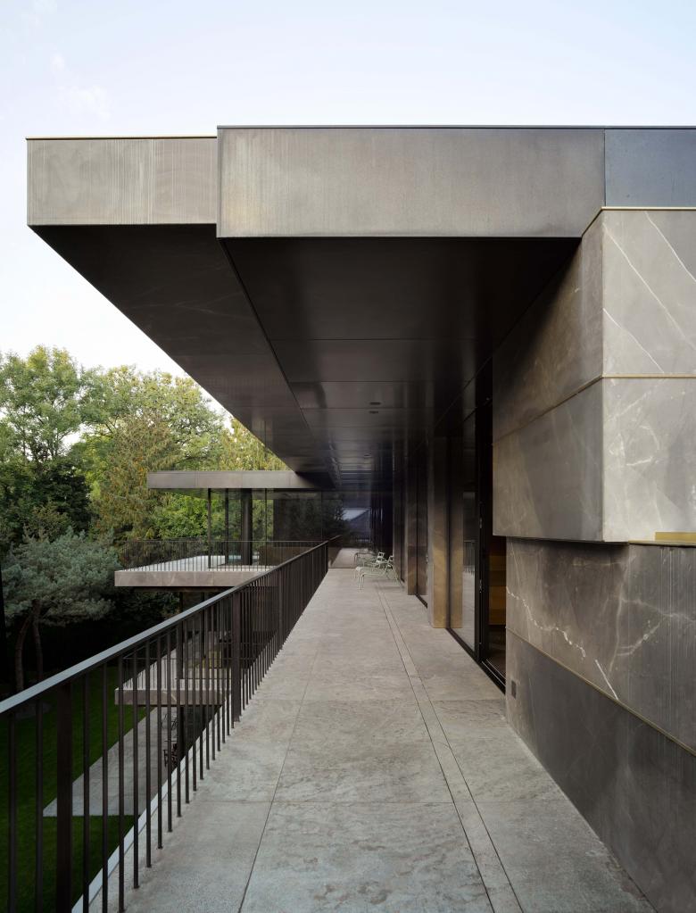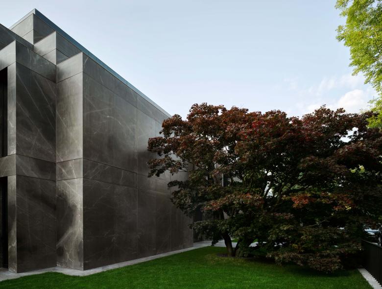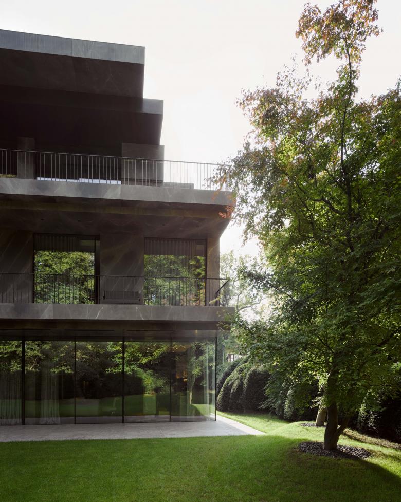 Because of its monumental facade facing the street, the house doesn’t require a wall or gate for privacy. The house stands free and fully visible while simultaneously offering privacy for the interior. The garden was designed with a natural chain of trees and bushes to create an array of lush green spaces around the house. An old Japanese Acer tree stands majestically in front of the imposing marble facade and creates a beautiful play of shadows on the sheets of natural stone. At the back of the house, the crowns from a group of Pinus sylvestris trees create a natural response to the stark horizontal lines of the balconies projecting into the garden.