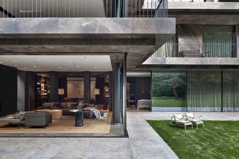 The palette of materials for the exterior is limited to brass, glass and bronze Gris Pulpis— a brown Spanish marble with white veins. The detailing of the facade is kept extremely clear in its lines and expressions, removing any element that suggests mechanical or technical movement, such as hinges and sliders. The natural stone continues onto the ceilings of the roof overhangs that face the garden and extends into the villa to strengthen the seamless transition between interior and exterior. The timeless interior of the house was designed by Studio Christian Liaigre in Paris.