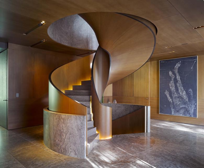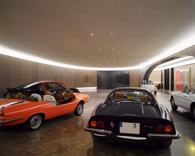 On the first floor, a long corridor stretches along the street facade, giving access to the bedrooms. Services are located in the mid-section of the building, forming a clear strip of elegant enclosed spaces while maximizing the garden views from each bedroom. On the lower floor, the logic of a coherent promenade from darker to luminous spaces is enhanced through a spatial sequence that ends in the large balconies with a river view. The second floor houses the pool and gym, also capitalizing on the spectacular views over the river and adjacent park. Water reflections blend the colors of the marble slabs and create an abstract and intangible space, while large glazed surfaces emphasize the continuity between interior and exterior. In the basement, the garage is designed as a wide hall with unconventional materials for its purpose: wooded walls and a natural stone floor. The curvilinear walls of the space form a ‘unicum’ compared to the orthogonal severe shapes of the villa: a dynamic and impressive entrance room or ‘rotonda’ for motorized access.