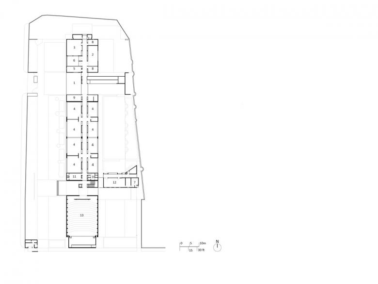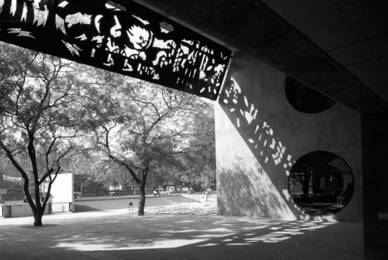 In response to the client’s brief and the row of 8 existing shady Neem trees on the site; the building is conceived as a linear, 2-storeyed, cast in-situ exposed concrete structure aligned parallel to the trees. A pedestrian promenade traverses under the trees and leads to the ceremonial, double height foyer which provides access to the classrooms, seminar halls, boardroom and bookshop on the ground floor. It also connects to the processional ramp leading to the first floor where a library, an exhibition space and a 250-seat auditorium are housed. The large glazed openings of the building enable even and deeper penetration of daylight, enhance the transparency of the building and extend the vistas across the site. They also provide a subtle contrast to the monolithic grey concrete.