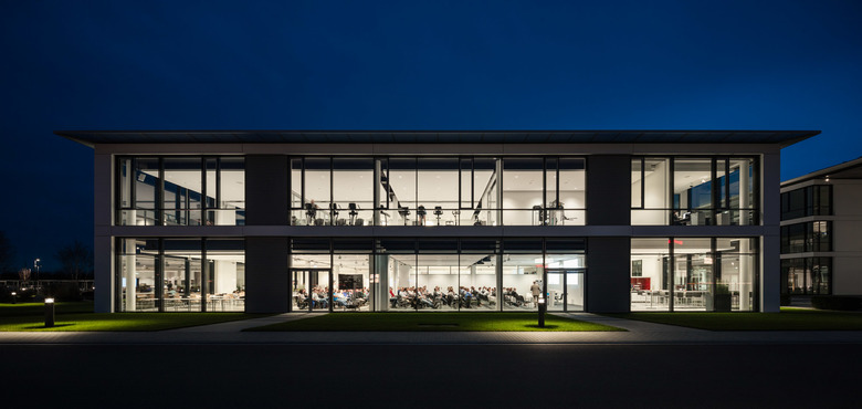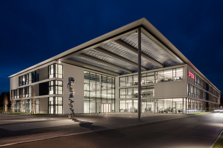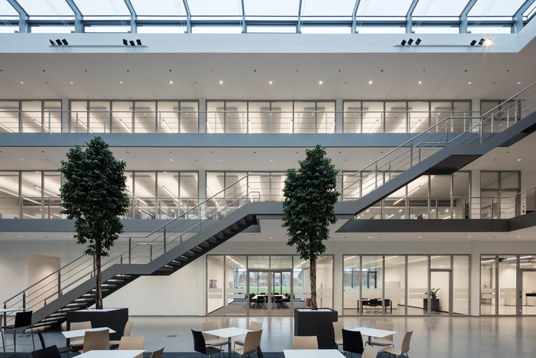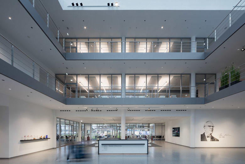 Den Mittelpunkt des Verwaltungsgebäudes bildet ein großzügiges Atrium, an den sich zwei Gebäuderiegel anschließen. Hier sind Büroräume, Besprechungs- und Kommunikations-zonen, Mitarbeiter-Treffpunkte und ein Ausstellungsbereich zur Firmengeschichte untergebracht. Rund 600 Mitarbeiter steuern am neuen Standort den weltweiten Einkauf, die Entwicklung sowie die Elektronik und Informationstechnologie der Unternehmensgruppe.