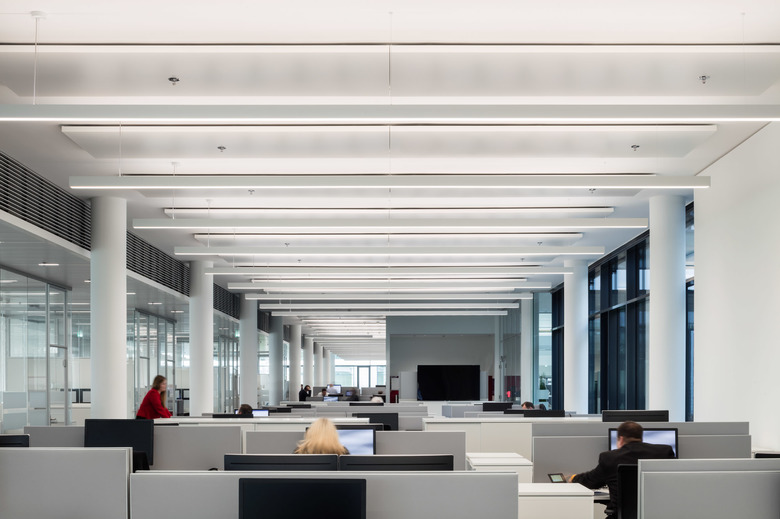 Eine großzügige Fensterteilung, weiße mäandrierende Geschossgesimse und Füllungen aus gekanteten Aluminiumpanelen definieren das lineare Gestaltungsraster des Gebäudes. Die Architekten BM+P Hesse Haselhoff Geissler und das Lichtplanungsbüro Tropp Lighting Design haben den Anspruch an Offenheit und Transparenz durchgängig umgesetzt. Das Zusammenspiel von Architektur und Lichtführung spiegelt sich in der planerischen und technischen Umsetzung des streng linearen Beleuchtungskonzepts wider. Pendelleuchten mit einer Länge von 5,50 m, die sich mit gleich langen Akkustiksegeln abwechseln, führen die klare Linienführung des gesamten Gebäudes weiter fort. Auch in der Nacht unterstreicht die Beleuchtung die lineare Gliederung der Fassade. Im ganzen Gebäude treten ausschließlich Lichtlinien von Pendelleuchten hervor, andere Lichtquellen sind nicht zu erkennen.