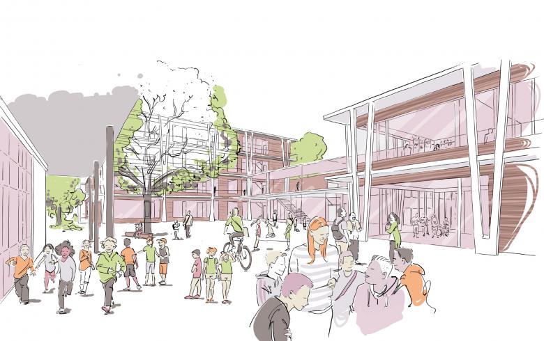 Das „Klassenhaus“ fügt sich im Nordosten zwischen die Bestandsbäume ein. Sechs Klassenräume je Etage und die flexibel nutzbaren Kursräume umranden die Erschließungsflächen mit den Lerninseln und bilden ein Cluster. Ein zweigeschossiger, transparenter Verbindungsbau bildet den Eingang für die einströmenden Kinder und Jugendlichen und verknüpft das riegelförmige Zentralhaus (Bestandsgebäude) mit dem Klassenhaus und dem zweigeschossigen Gemeinschaftshaus auf kurzen, direkten Wegen. Das Gemeinschaftshaus bildet durch seine Ausformung und Lage (zwischen Wilhelm-Hausenstein-Allee, Sporthalle und Klassenhaus) einen Zugang mit gefasstem Schulhof aus. Im Erdgeschoss befindet sich, gut erreichbar, der gemeinschaftliche Essensbereich. Das bestehende, eingeschossige Gebäude im Süden an der Kurt-Schumacher-Straße wird zu einem weiteren städtebaulichen Baustein. Es erhält eine Erweiterung und damit einen Abschluss nach Westen und bildet gleichzeitig den Abschluss der Schulanlage im Süden. Es wird zum Ganztagshaus, da es zukünftig ausschließlich für die Zeit nach dem Schulunterricht genutzt wird. Der letzte neu hinzukommende Baustein, das Jugendhaus, formt den südöstlichen Abschluss und wird gleichzeitig zur eigenständigen Adresse für Jugendliche jenseits des Schulbetriebs.
