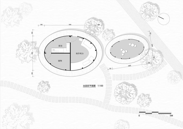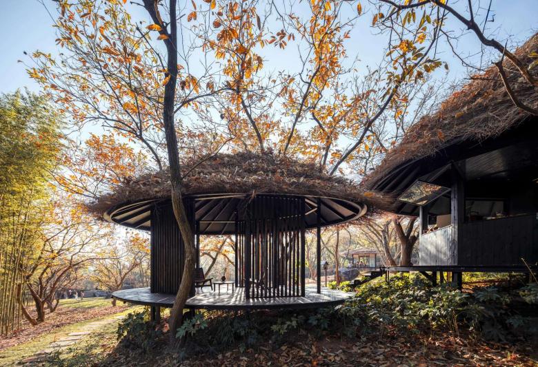 The Woodland Tea House lies opposite the serving area, hidden in the chestnut grove. Designed with the core idea of "blending into nature", it uses an elevated lightweight steel structure to maximize preservation of native vegetation and terrain. From a hillside view, the tea house blends into the wooded slope, blurring the line between man-made structures and nature.