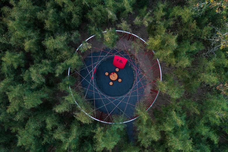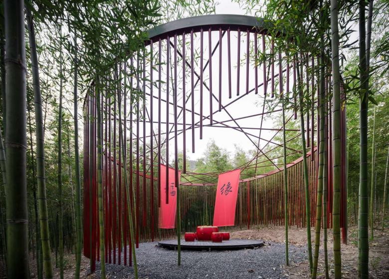 The Wind Chime Bamboo Installation is nestled in a lush bamboo forest, serving as a forest retreat for photo ops and mental relaxation. Its circular layout features red metal rods hanging to mimic bamboo nodes, creating a striking visual dialogue with the forest. As the wind sways the rods, their gentle chimes evoke the lively spirit of wind chimes.