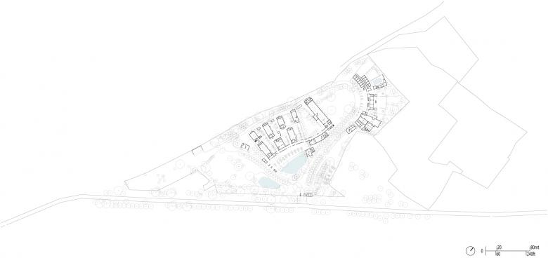 Accordingly, the scheme is organized as an ensemble of three detached building clusters conceived as distinct entities, yet as inseparable components of an integrated development. The office cluster comprises seven linear buildings, with interspersed courtyards, radiating from a centrally located pond. The second cluster is designed in a crescent configuration and incorporates community facilities such as a sports centre, a meditation hall, a guest house, an amphitheatre, a guest house, a kitchen and dining area. The third cluster comprises the directors’ offices.