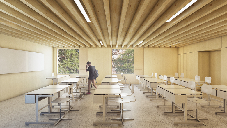 Le projet se présente sous la forme d’un volume compact composé de branches qui tissent des relations avec les différentes parties du site. Une passerelle relie l’école avec la partie haute du site. Les salles de classe s’organisent en hélice de moulin autour d’un couloir central en forme de baïonnette. Elles se regroupent par paires en bout de couloir autour d’un vaste dégagement ouvert à la lumière et contenant les accès aux salles de classe et aux casiers des élèves. Elles jouissent toutes d’une double ou d’une triple orientation pour favoriser l’apport de lumière naturelle à l’intérieur de la salle de classe, ainsi que la ventilation naturelle. Les parties communes, l’escalier et les locaux annexes, se concentrent au centre de ce dispositif.