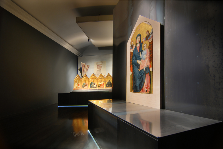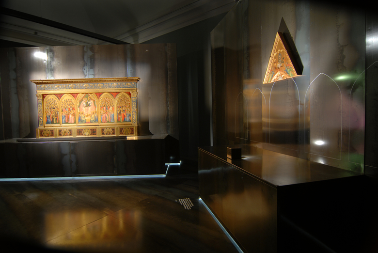 Set. Not a true theatre, the Palazzo Reale is transformed into a total theatre, a place of meeting and exchange for the audience (us) and the characters (Giotto’s works) with the force of two powerful stage machines: light, in all of its manifestations including also half-light, shadow, darkness and the control of the reflections and of colour.