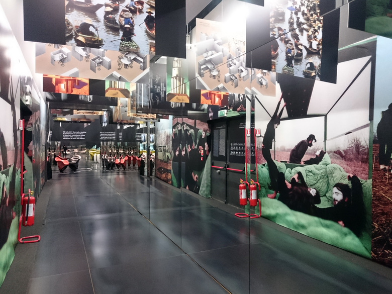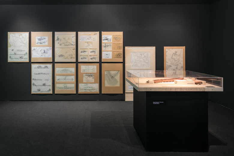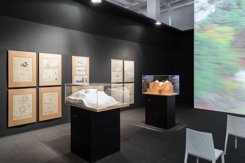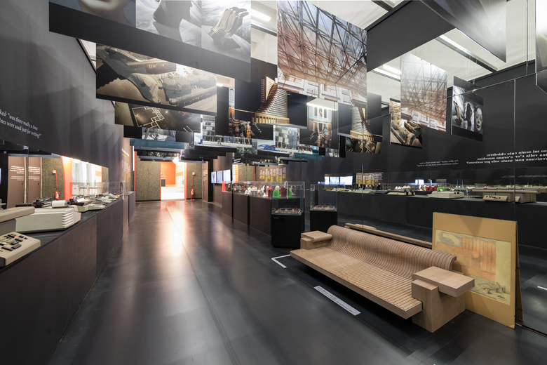 In the five rooms, architecture and exhibition displays, which naturally cannot be transported, are illustrated by means of sketches, drawings, models and giant projections. This is the only way of transporting the visitor, almost in audio and visual real time, into buildings dotted around the world.