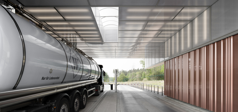 Das Werkstor wird in Zukunft eine klare Schnittstelle zwischen Werk und Umfeld definieren. Ergänzend wird der Prozess Verwiegung von LKW direkt in das Tor integriert und somit gegenüber früherer Praxis optimiert. Auch architektonisch bildet das Werkstor eine sichtbare Schnittstelle nach außen. Dazu wurde eine der Unternehmensphilosophie entsprechende Architektur entwickelt.