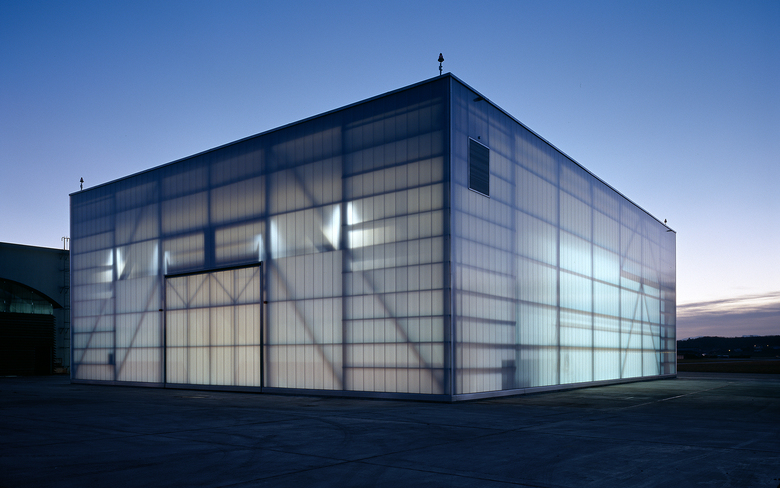 Située en limite sud de l’aérodrome de Payerne, cette halle est destinée au lavage des avions et des véhicules spéciaux de l’aérodrome. Le volume est simple, en adéquation avec le programme: une structure métallique habillée de panneaux en polycarbonate résistant à l’eau pour les façades et des plaques de tôle ondulée Montana pour la toiture. De grandes portes basculantes permettent l’accès et la sortie des engins. A l’intérieur, les locaux annexes (vestiaires, dépôts, locaux techniques) sont insérés dans deux volumes plus petits, également habillés en polycarbonate. Le choix de ce matériau a été dicté à l’usage de la halle (le lavage des engins), pour ses bonnes qualités thermiques et pour son aspect translucide, transformant cette halle en boîte lumineuse dans la plaine de la Broye, particulièrement visible depuis l’autoroute proche. Un système innovant de traitement des eaux de lavage a été réalisé à l’extérieur du bâtiment.