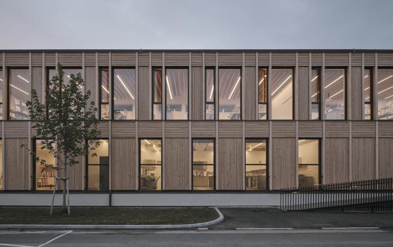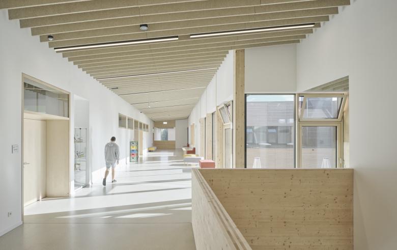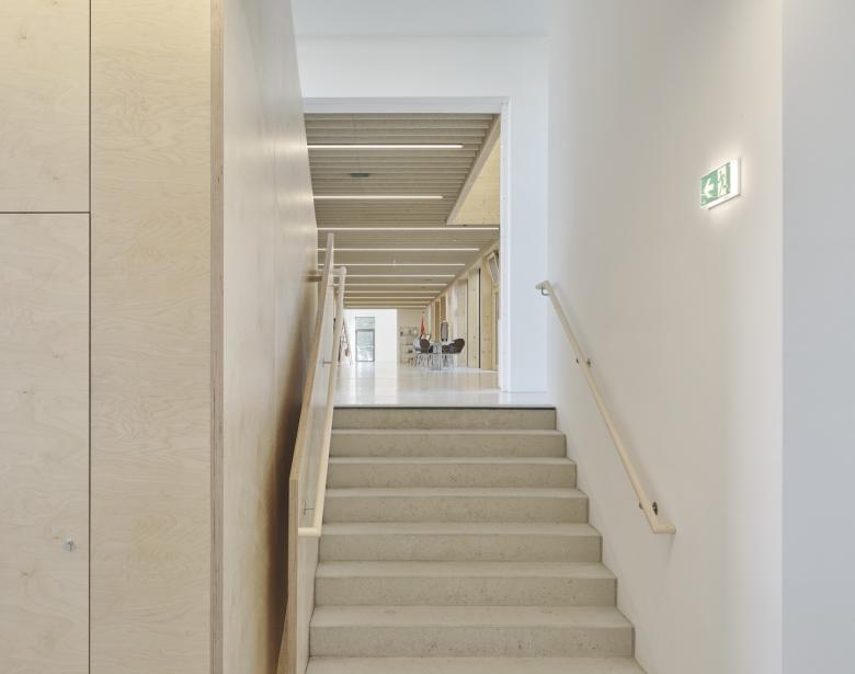 Der Neubau wird barrierefrei erschlossen und löst mit einem Stiegenhauskern geschickt die Split-Level-Anbindung an den Altbau. Die funktionelle Gliederung des Um- und Zubaus besticht durch seine klare Einfachheit und trägt so zu einer guten Orientierung im Gebäude bei. Die Anordnung des Schulrestaurants im Innenhof stellt einen zentralen Mittelpunkt der Schule dar, die das tägliche Leben einer HLT repräsentiert.