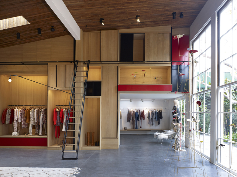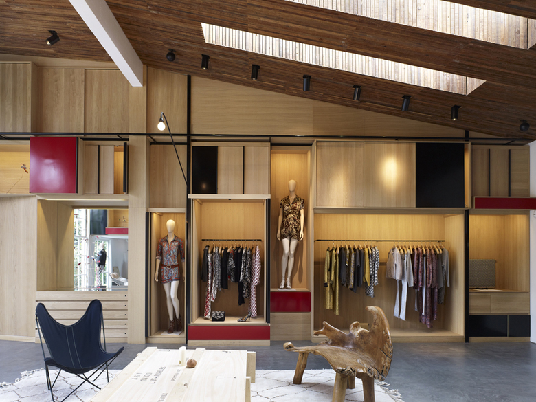For only her second US boutique, Montalba Architects was selected as the Executive Architect, alongside Isabel Marant's in-house design team and Parisian architects Franklin Azzi Architecture, to create a space that feels simultaneously luxurious and laid back, the perfect blend of California modern and French bohemian. The gallery-like front-of-house takes advantage of the original wood structure, inserting several linear skylights between framing members, and bringing natural light deep into the interior. The large restored vertical-sliding windows reinforce the indoor-outdoor connection, opening up to a vast landscape of local desert plantings and wood decks. Inside, plywood paneling opens to reveal display nooks, or remains closed for art installations or to create a simple lounge area. Concrete floors and vintage lighting continue through to the tucked-away main retail floor and on to the back-of-house offices.