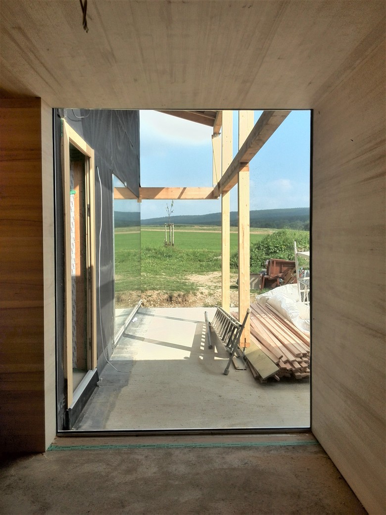 Aus diesen Gegensätzen leitet sich das Entwurfsmotiv ab. Durch wenige Handgriffe offenbart der vorher verschlossene und abweisende Baukörper sein überraschend geräumiges inneres Raumgefüge von Wohnhaus, Jagdzimmer und Patio. Großflächige Verglasungen öffnen den Innenraum zur Landschaft. Zwischen innerer und äußerer Hülle entsteht ein hybrider Raum, dessen Nutzung und Charakter sich mit der Stellung der Schiebewände ändert.