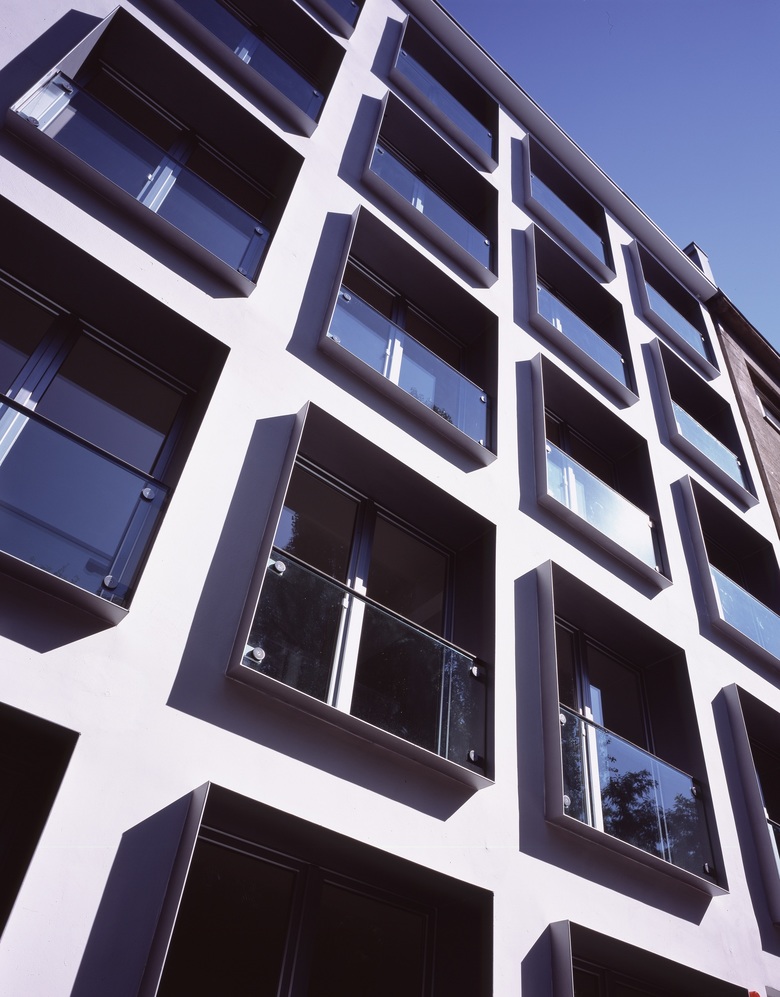 Da die Balkone sich auf der Nordseite des Hauses befinden, wurde eine Kompensationsmassnahme in Form von groß bemessenen Stahlzargen, die 15 cm aus dem Gebäude herausragen und innen angeschlagene Fenster aufweisen, für die balkonlose der Strasse zugewandten Südfassade entworfen. Diese bieten für einen Austritt Platz und haben als äußeren Abschluss eine gläserne Brüstung. Somit wird dem Grün der Alleestrasse und dem Licht in die großen Wohn- und Essbereiche ungehindert Einlass gewährt.