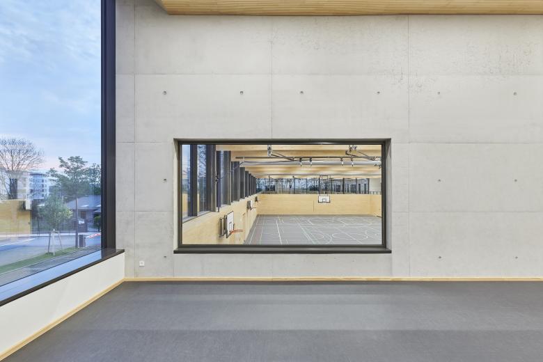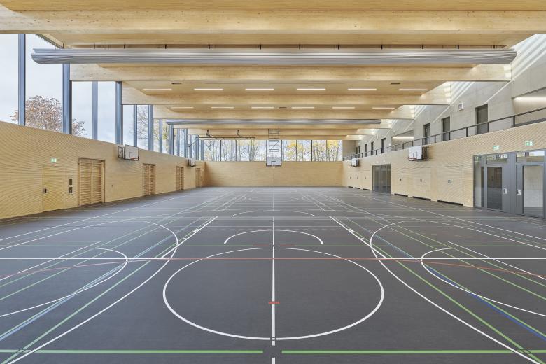 Über zwei Vorzonen gelangt man vom Flur aus in die dreifach teilbare Sporthalle. Das sichtbare, klar strukturierte Tragwerk aus Leimholzbindern schafft, zusammen mit der abgehängten Decke, den integrierten Lichtleisten und insbesondere der Wandverkleidung aus schmalen Fichtenholz-Lamellen, eine ruhige Raumatmosphäre und -akustik. Die großzügige Verglasung der Halle bietet maximale Helligkeit: Die großen Fensteröffnungen, die sich am oberen Hallenrand wie ein Band von der West- bis zu Nordseite ziehen, sowie die nach Osten ausgerichteten Oberlichter verbinden das Halleninnere mit der natürlichen Umgebung. Die sich bei Wind bewegenden Baumwipfel lassen ein beeindruckendes Licht- und Schattenspiel im Innenraum entstehen, das sogar durch die temperatur- und windgesteuerten Markisen sichtbar ist. Oberhalb der Halle verläuft ein schmaler Flur mit Brüstungen aus Stahlblech, der auch ohne Bänke als kleine Tribüne genutzt werden kann. Hier befinden sich die flexibel teilbaren Umkleideräume sowie weiter südlich auch die Sonderräume wie der großzügige Gymnastikraum. Mit seinen großen Fensterflächen und zusätzlicher Verglasung in Richtung Sporthalle vermittelt dieser das Gefühl, sich mitten in der Natur zu bewegen – ja, zwischen den Bäumen zu tanzen.
