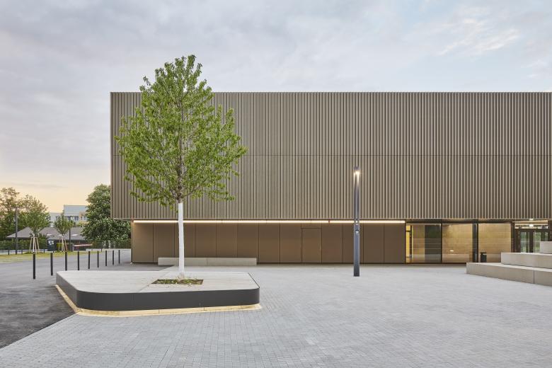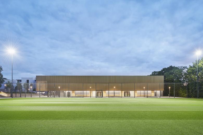 Der kubische Bau überzeugt schon von Weitem durch seine Schlichtheit und zurückhaltende Eleganz: Mit einer Fassade aus perforiertem, feingliedrigem Trapezblech und umlaufenden Fensterbändern bildet die neue Sporthalle in Gerlingen einen beeindruckenden Auftakt zum „Breitwiesen Stadion“. Das Gebäude, das im Herbst 2022 durch Thoma. Lay. Buchler. Architekten fertiggestellt wurde, schließt unmittelbar an die bestehende Außensportanlage und den neuen, am Spielfeld entlanglaufenden „Sportlerboulevard“ an, der eine Verbindung zu den seitlichen Tribünen sowie zum angrenzenden Schulhof der nahegelegenen Schule schafft. Damit fügt sich die Halle harmonisch in die umliegende Natur sowie die Nachbarbebauung ein.
