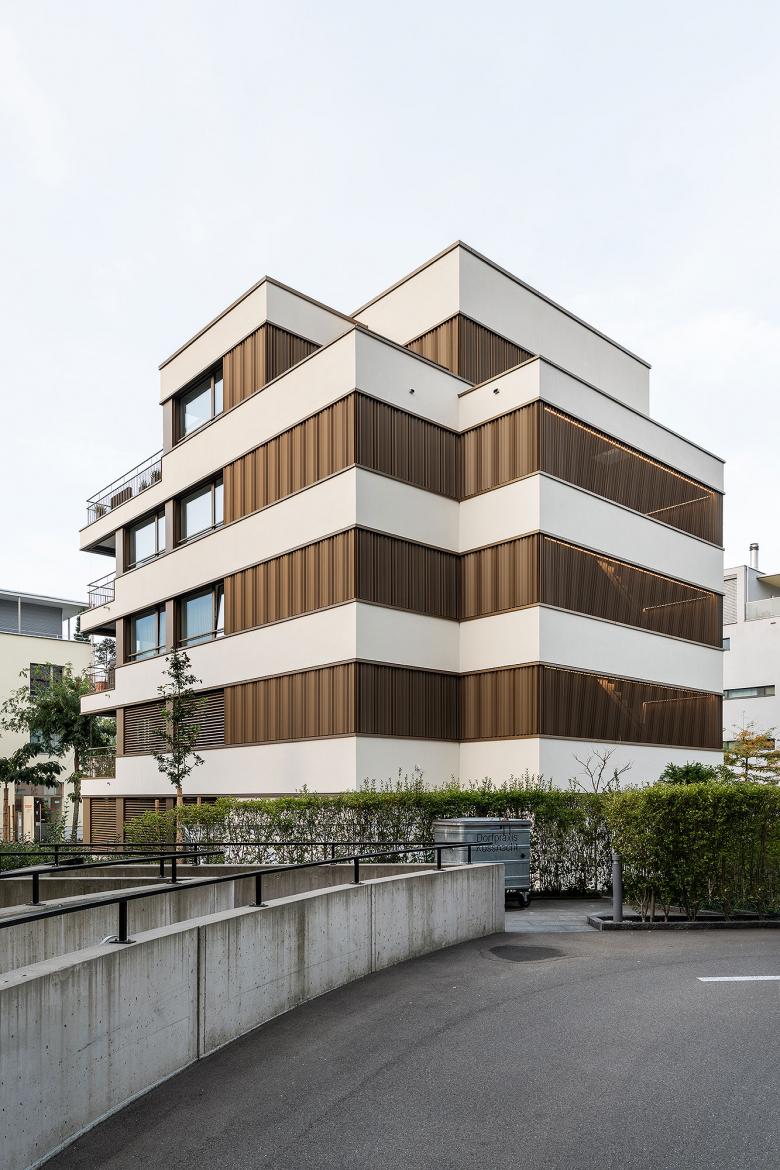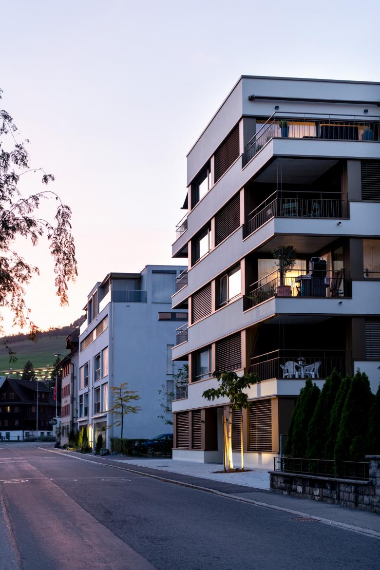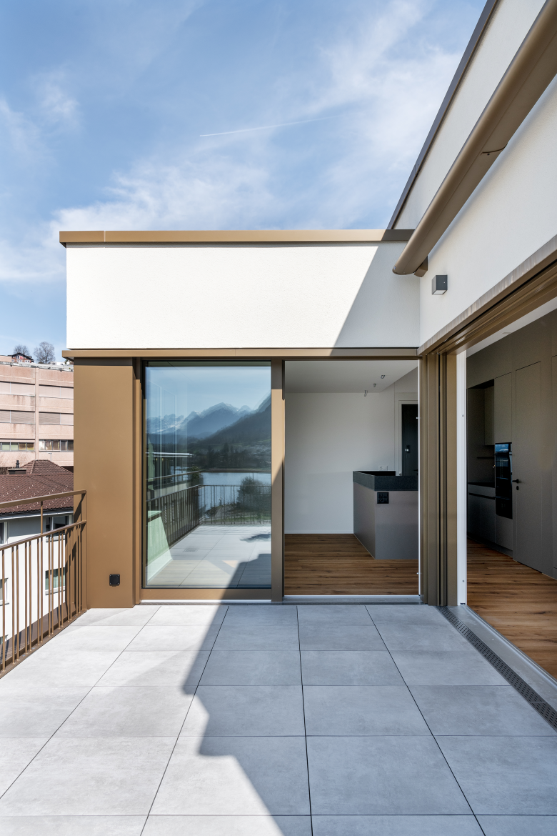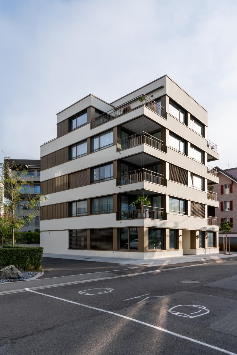 An zentrumsnaher Lage nahe des Bahnhofs und des historischen Küssnachter Ortskerns fügt sich der neue Baukörper schlüssig in die gewachsene Bebauungsstruktur entlang der Luzernerstrasse ein. Die flexibel bespielbare Gewerbenutzung im Erdgeschoss weist eine direkte, attraktive Anbindung an den Strassenraum auf. Der Hauszugang wie auch das aussenliegende Treppenhaus mit Lift befindet sich auf der strassenabgewandten Nordseite des Gebäudes. Erschlossen werden auf drei Obergeschossen und einen Attikageschoss total 6 Wohnungen, davon zwei attraktive Dachmaisonetten mit grossen Aussenterrassen und Seeblick. Das Gebäude weist eine sehr hochwertige Fassadenkonstruktion mit einer fein gegliederten Bänderung aus Putz- und Metallelementen auf. Die bronzefarbigen Metallteile werten die äussere Erscheinung des Gebäudes zusätzlich auf.