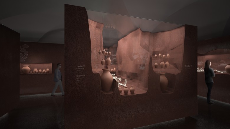 For the display of the tombs and funeral remains, Bellini designed showcases of great rusted iron ‘’masses’’ which reproduce the original excavation feeling through spectacular sections.