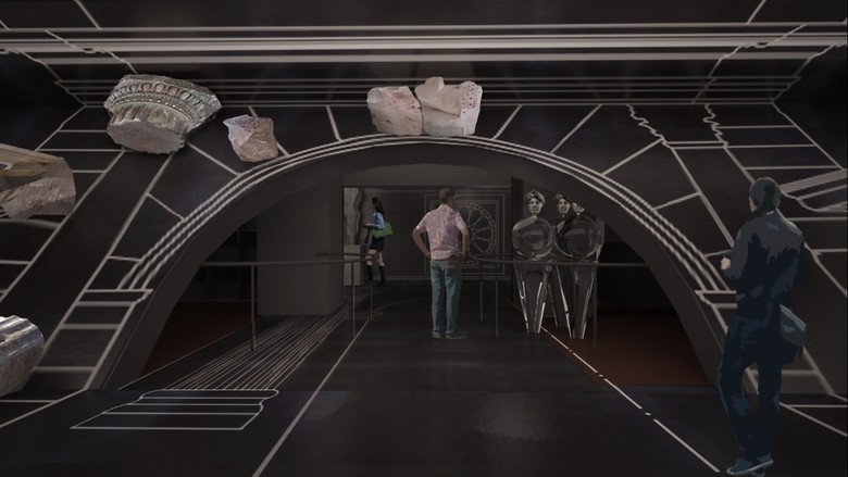 The positioning of the glass volume reconstructs the chamber’s geometry of the goddess of Rome.