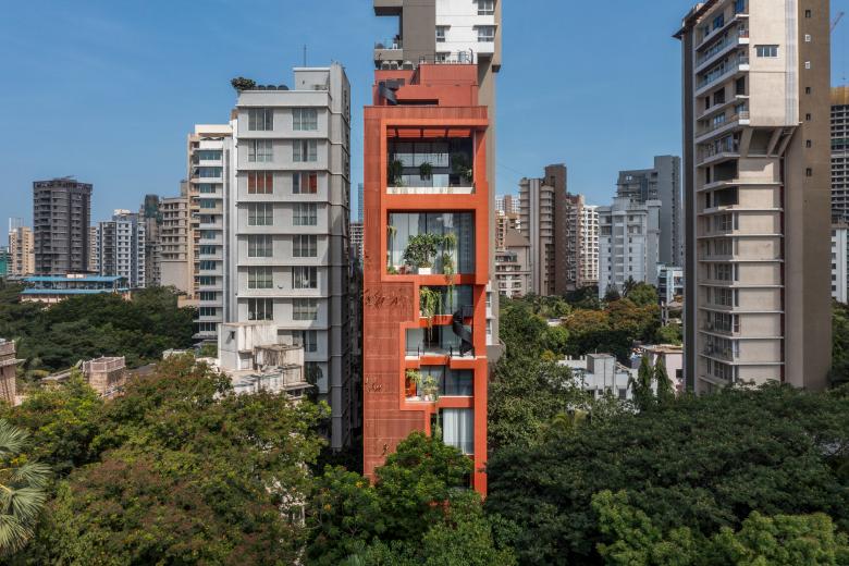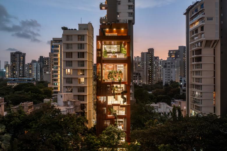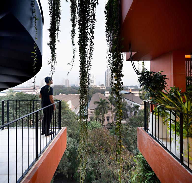 Greenery laces the vertical void . An attempt to make the connection between life and nature. A natural response of red earth and green in an otherwise concrete jungle. We hope to steer architecture in our maximum city to a natural endearing way to urban life .