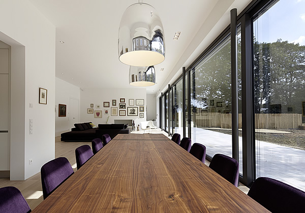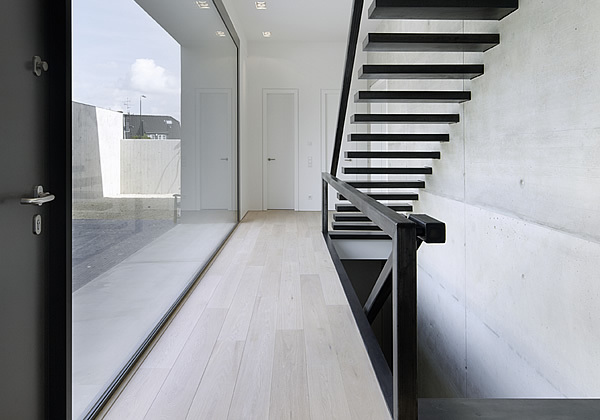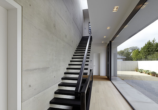 Sämtliche Räume gruppieren sich um eine das Haus stabilisierende in Sichtbeton gehaltene Wandscheibe, die über alle Geschosse reicht und gleichzeitig auch als Treppenwange fungiert.