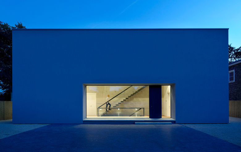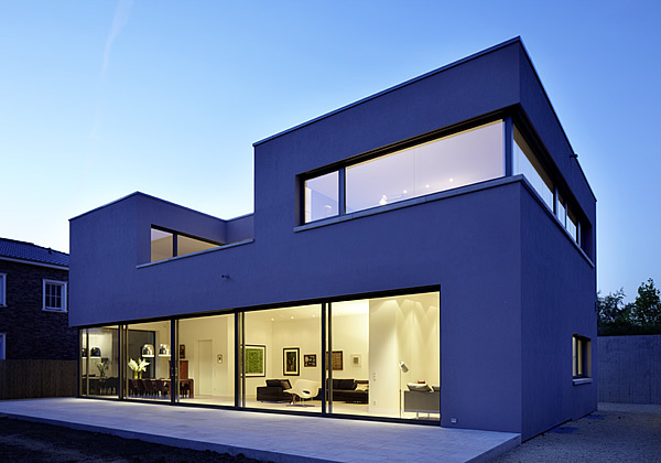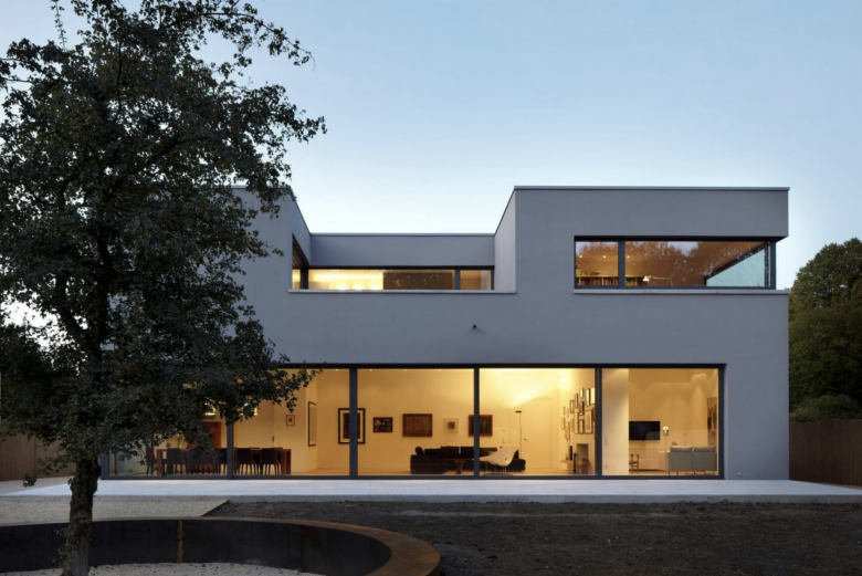 Das einfache, rechtwinkelige Gebäudevolumen des Einfamilienhauses verschließt sich gegen den öffentlichen Raum und öffnet sich vollständig zum Garten hin. Der Wohn-und Essbereich im Erdgeschoss verläuft fließend und der Schlafbereich im Dach gliedert sich separiert und generiert ein hohes Maß an Intimität.