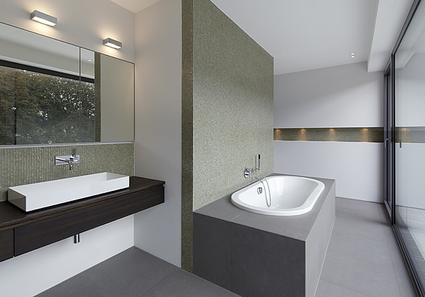 Besonders ist zu erwähnen, dass der Kubus im Obergeschoss eine großzügige, in das Gebäude eingezogene Terrasse aufweist, um die sich der Elternzimmertrakt erstreckt.