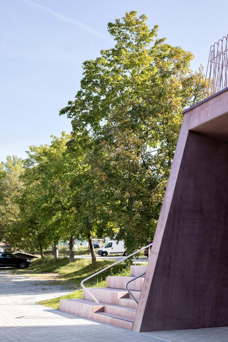 Die außenliegende Treppe verbindet die beiden Ebenen an zentraler Stelle derart, dass sie in selbstverständlicher Art den Übergang vom Gelände entlang des Parkplatzes zum Gebäude akzentuiert. So verschwimmt das Gelände nicht nur in Nord-Süd-Richtung sondern auch in Ost-West-Richtung mit der Umgebung.